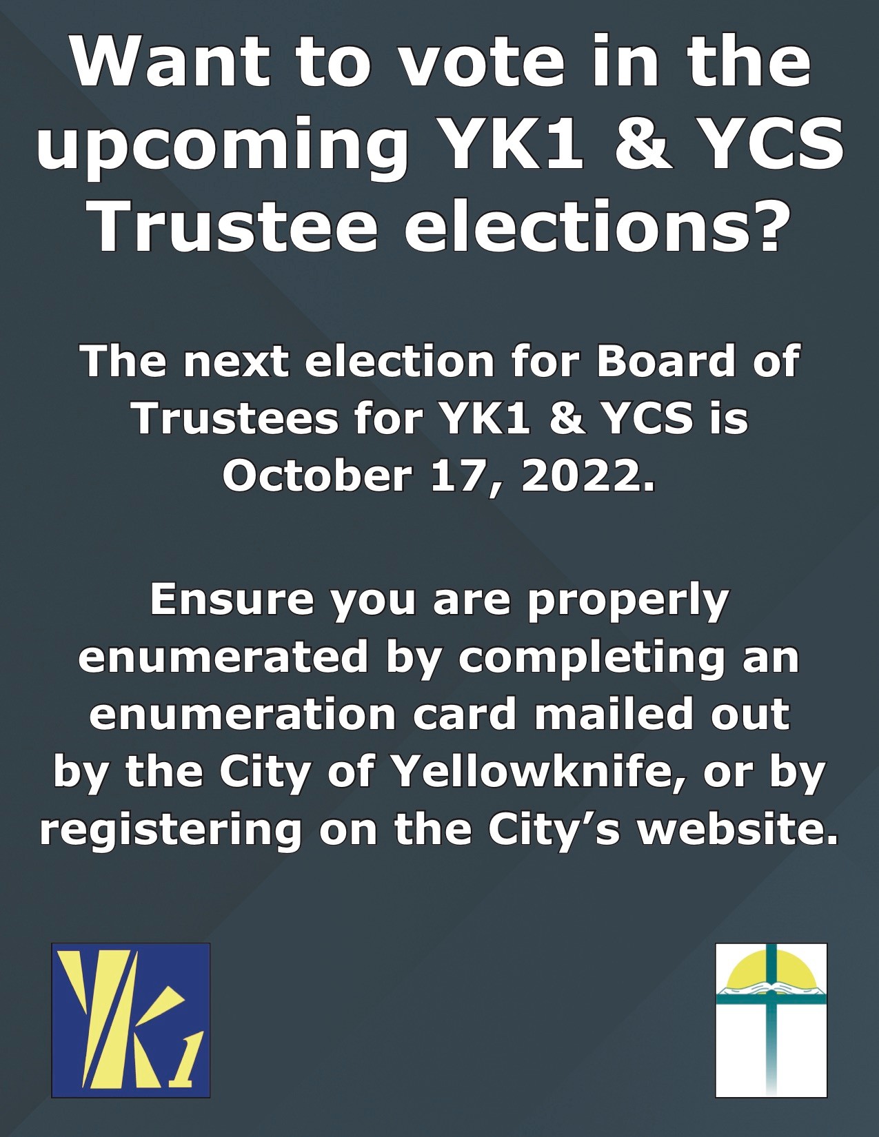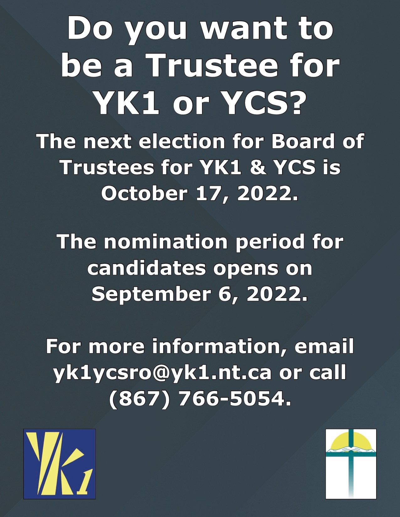 Interested in running as a candidate for the YCS or YK1 School Board Elections? Contact Mike Gibbins, Returning Officer, at 867-766-5054 or email yk1ycsro@yk1.nt.ca for more information and to obtain an application package.