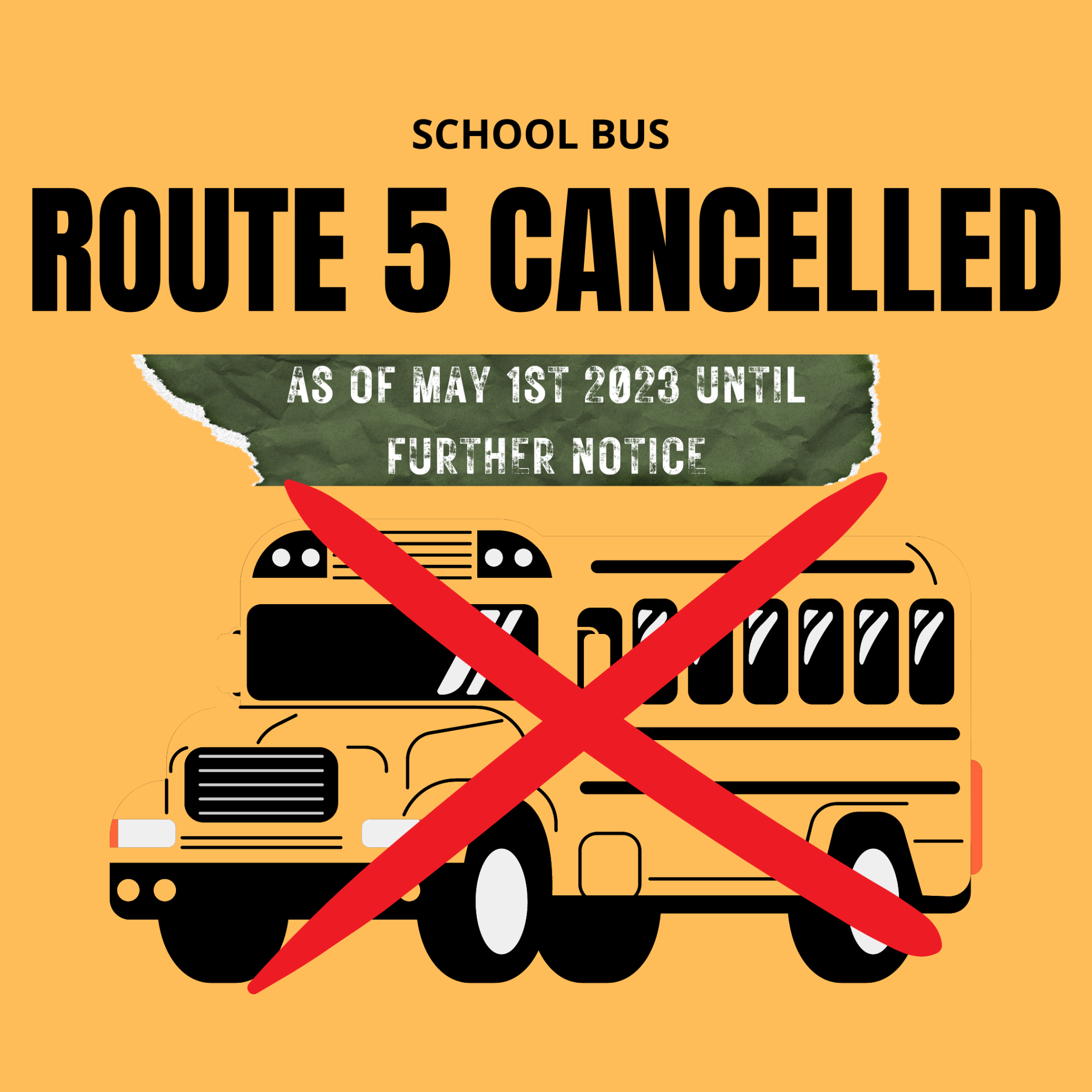Due to staff shortage Route 5 will be cancelled as of May 1st until further notice.