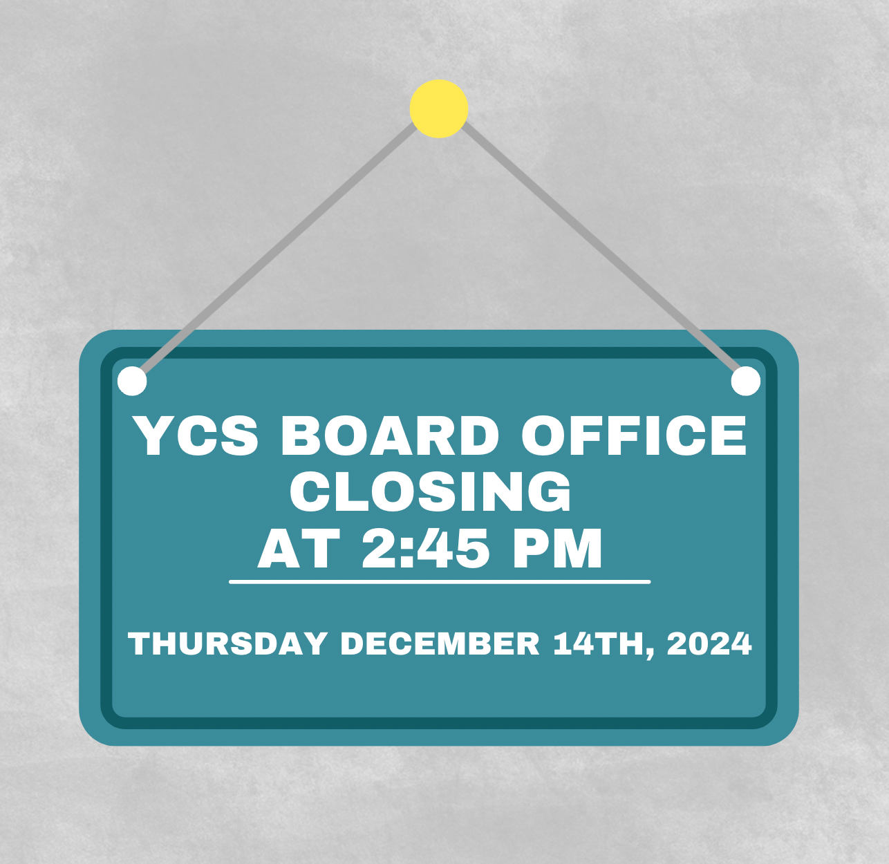 Please be informed that the Yellowknife Catholic Schools Board Office will be closing at 2:45 pm today, Thursday, December 14th.