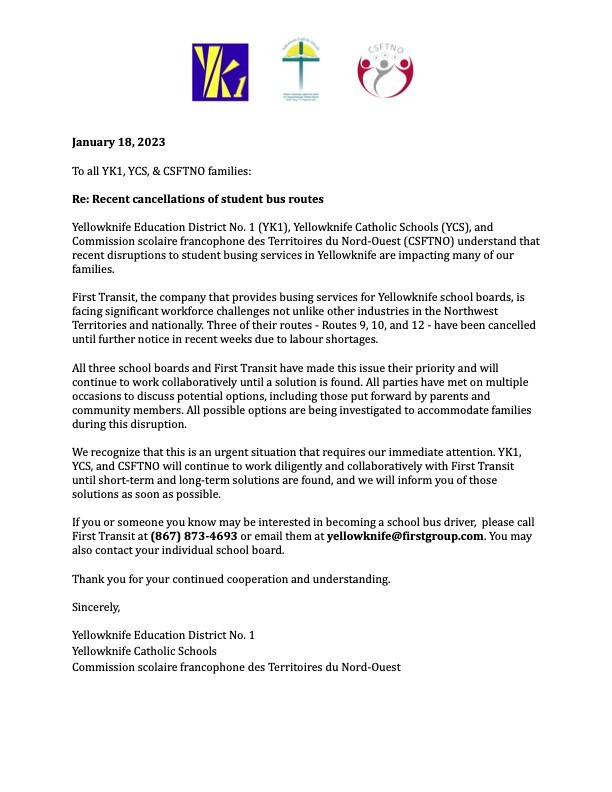 Please see the below letter that has been sent to YCS, YK1 and CSFTNO families regarding the recent cancellations of student bus routes.