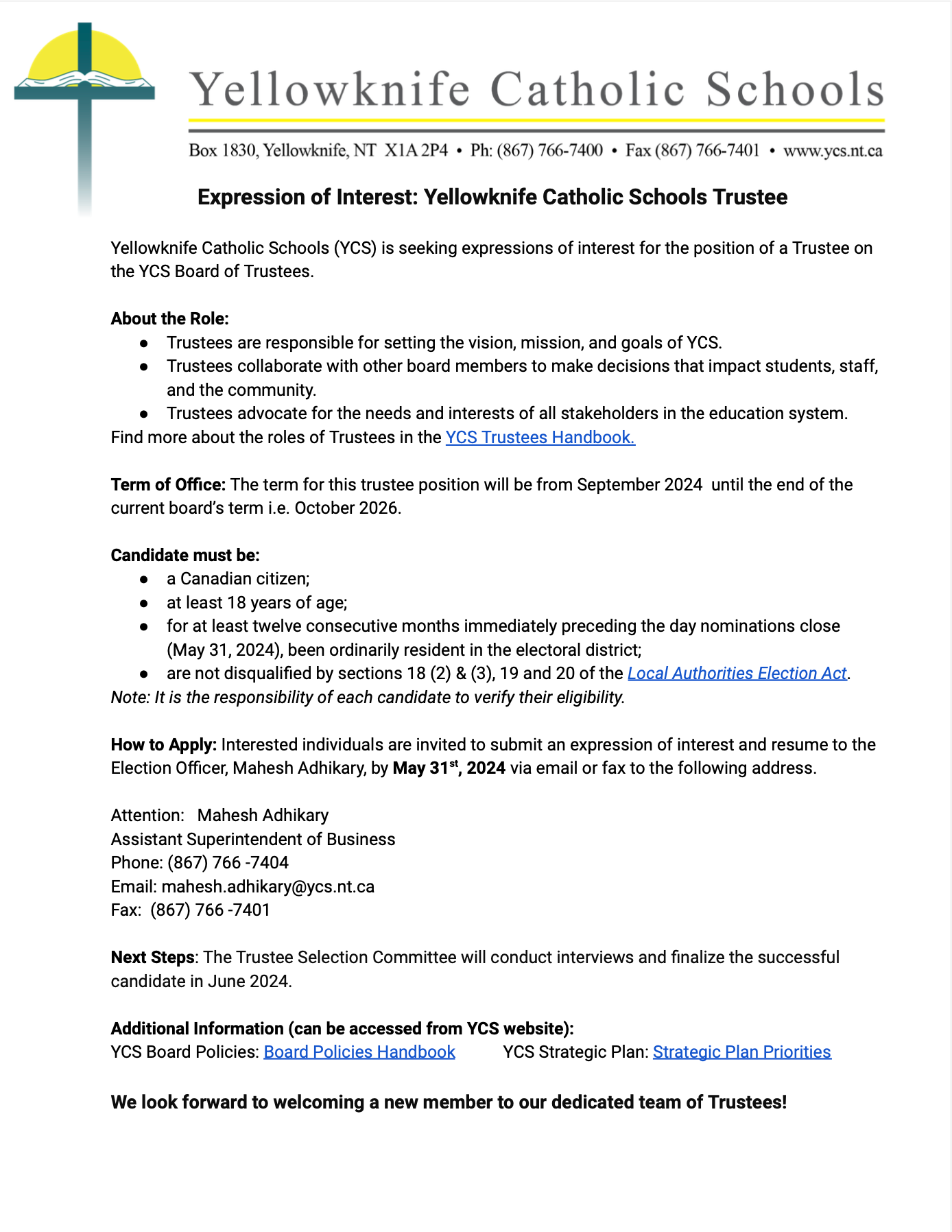 Please see the attached poster for more information regarding the Expression of Interest: Yellowknife Catholic Schools Trustee.