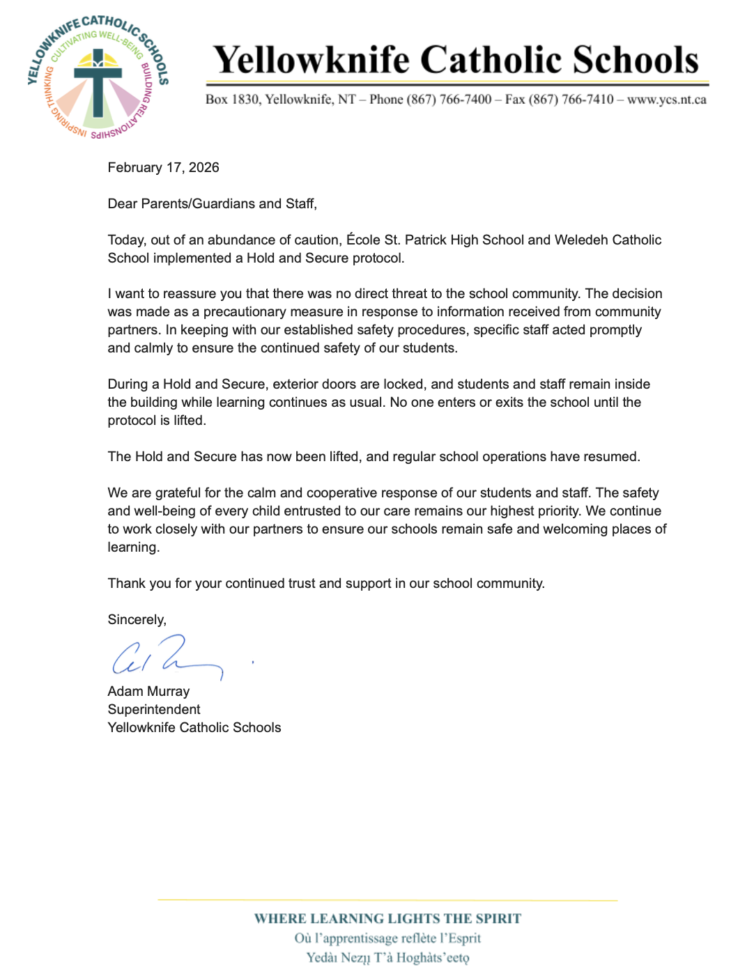Please see the attached letter regarding the Hold & Secure Protocol that was initiated at École St. Patrick High School and Weledeh Catholic School on February 17, 2026.