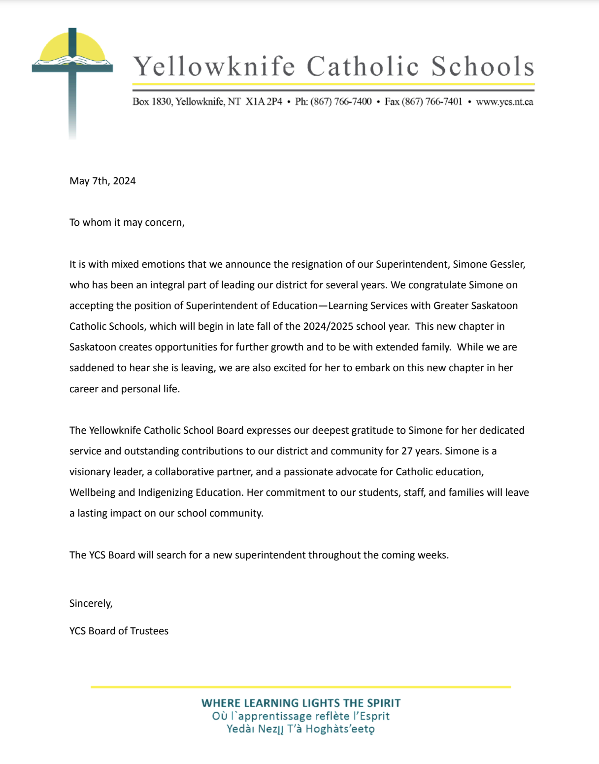 regarding the resignation of Superintendent Simone Gessler.