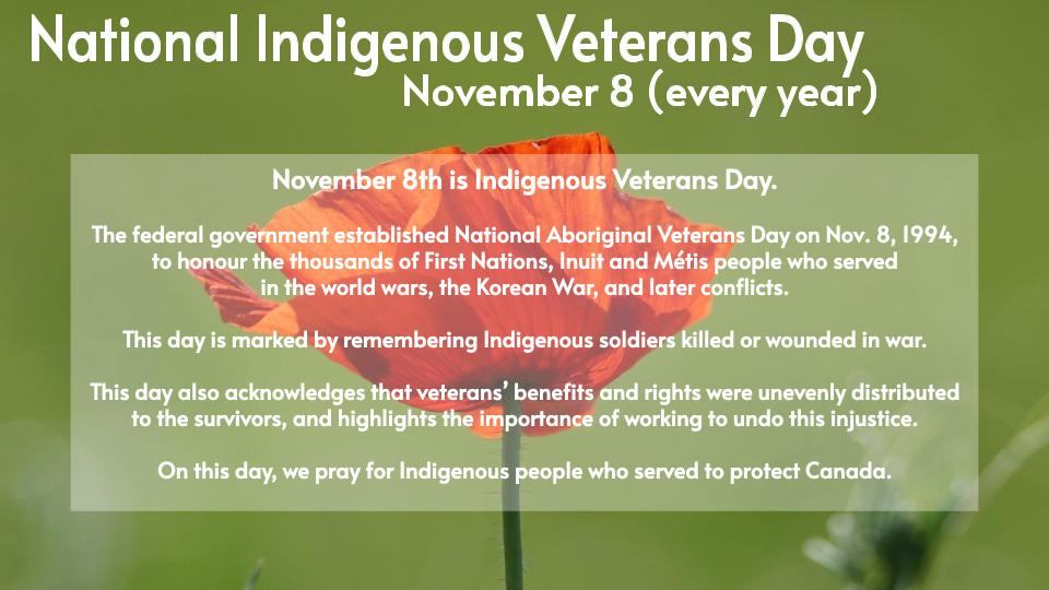 Please take a moment to remember the contributions of all Indigenous Peoples who have served for Canada, and possibly even the injustices of those veterans who returned from battle and were not treated to the same freedoms as their comrades.
