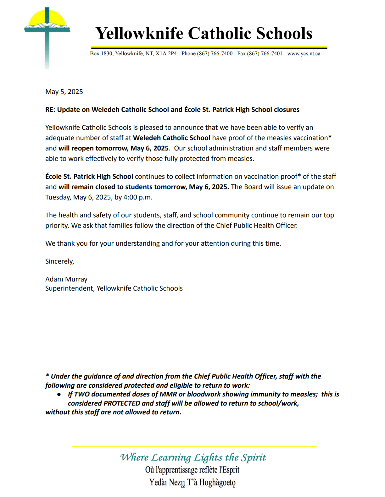 Please see the attached letter regarding the status of Weledeh Catholic School and École St. Patrick High School for May 6, 2025.